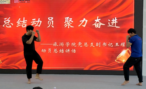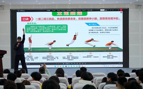 仪式现场,旅游学院党总支副书记王耀辉作动员讲话,他向全体学生提出三点希望:第一,要充分认识健康的重要意义,把健康作为成长成才的坚实基础,树立“健康第一”的理念;第二,要以此次行动为契机,坚持常态化体育锻炼,在运动中磨砺意志品质、涵养阳光心态;第三,要将健康理念内化于心、外化于行,以强健体魄、坚韧意志和良好素养奔赴未来,绽放青春光彩。在随后举行的体育健康导师聘任仪式上,旅游学院党总支副书记刘海燕为受聘导师颁发聘书。体育指导教师陈焕娣围绕体质健康抽测项目,系统讲解动作要领、训练技巧与安全注意事项,助力学生们科学锻炼、有效提升体质。活动现场还宣读了“健康青旅计划”实施方案,明确行动目标、核心内容与推进安排,号召全院学生树立科学健康理念,养成常态化运动习惯。王耀辉为运动会参赛队员授旗,勉励大家发扬拼搏精神,以昂扬姿态展现旅院学子风采。授旗结束后,两名泰国留学生带来了精彩泰拳展示。