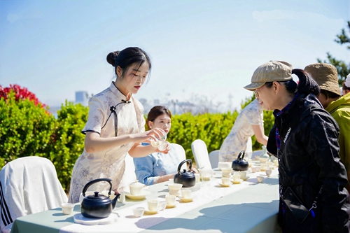志愿者向游客奉茶