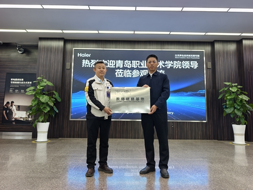 座谈中,杨春旺简要介绍了学校和海尔学院的发展情况,并围绕“党建引领下的产教融合生态化”主题,分享了学院深化校企党建联建“双链四联”机制、实现资源共享与优势互补的做法。郭强介绍了公司的发展概况、产品优势,表达了与海尔学院加强合作的意愿。双方就党建联建、教师研修、现场工程师培养、技术服务、学生实习就业等方面进行了深入探讨。随后,举行了“教师研修基地”授牌仪式。
