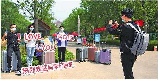 5月16日,青岛职业技术学院返校大学生在校门口合影留念。(□卢鹏张进刚报道)