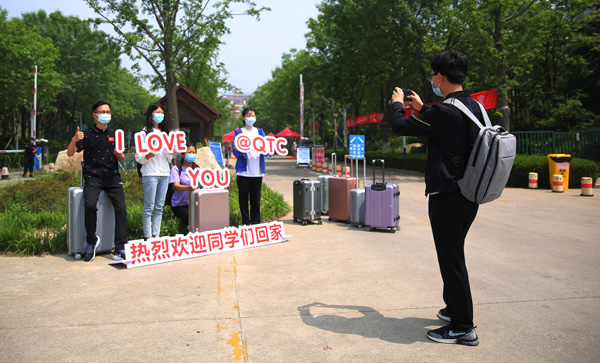 5月16日,青岛职业技术学院,顺利返校的大学生高兴地在校门口合影留念。