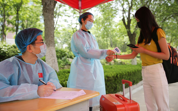 扫码签到,手部消毒,每日三测体温……天子骄子,返校复学了! 5月16日,青岛职业技术学院毕业年级大学生平安返回位于青岛市西海岸新区的主校区,在进行各项检查、信息核实登记后,陆续进入学校。 图为学校工作人员在对报到学生进行第一轮体温检测。 (大众日报客户端记者 卢鹏 通讯员 张进刚 报道)