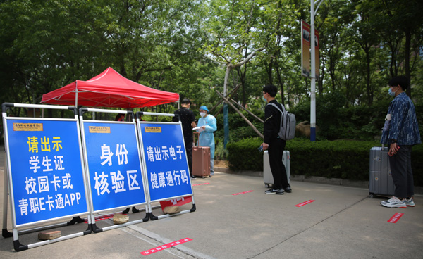 青岛职业技术学院,返校学生间隔排队,等待进行身份核验等入校程序。