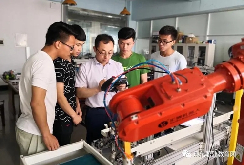 青岛职业技术学院机器人教学研发创新团队负责人、全国优秀教师李峰教授指导学生进行工业机器人编程