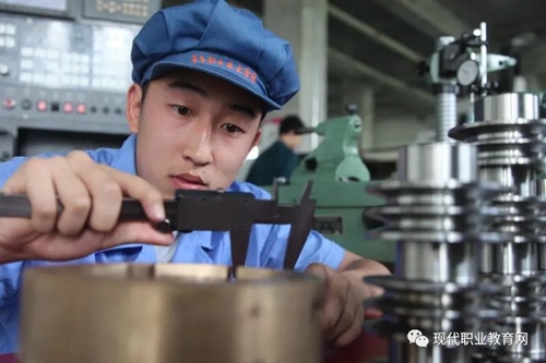 现代学徒制学生在校内校企实训基地检测数控加工产品