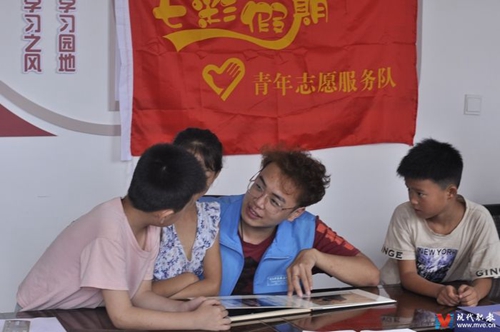 志愿者聆听孩子们讲述自己家乡的红色故事