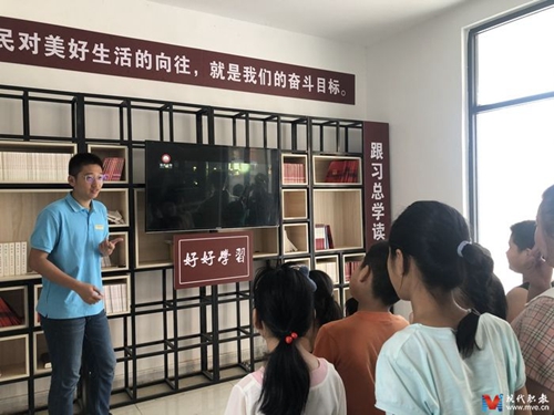 在活动现场,志愿者带领沂蒙老区的孩子们一起观看了《鉴往知来——跟着总书记学军史》主题纪录片,并从南昌城头的一声枪响讲起,用通俗易懂的语言深入浅出的为孩子们讲解了人民军队走过井冈山斗争、走过长征,走过抗日战争、解放战争、抗美援朝等胜利走向胜利的成长发展史,带领孩子们感悟改革创新的伟大力量。随后,志愿者们以“他(她),是我们身边的建国前老党员”为切入点,带领孩子们翻阅《沂水县夏蔚镇建国前老党员风采录》,引导孩子们逐一介绍了自己身边熟识的革命英雄前辈,详细讲述了自己耳熟能详的家乡红色革命故事,用饱含童真且朴实无华的语言生动传承和弘扬伟大的沂蒙精神。