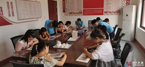 志愿者同孩子们一起翻阅《沂水县夏蔚镇建国前老党员风采录》