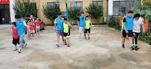 志愿者同孩子们一起参加两人三足跑活动