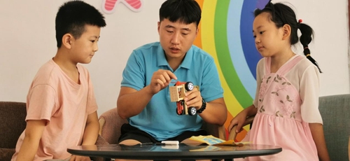志愿者与孩子们一起完成易拉罐简易机器人的制作