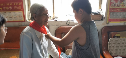 西村少先队员代表为谭玉相佩戴红领巾