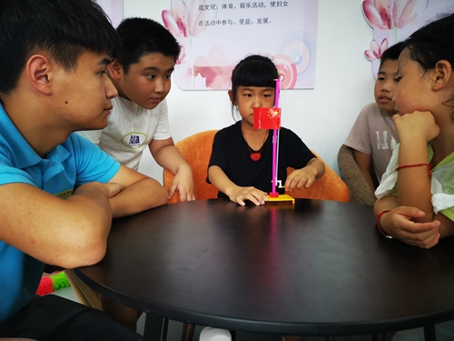 志愿者指导孩子们制作可升降国旗