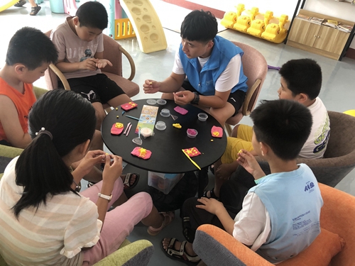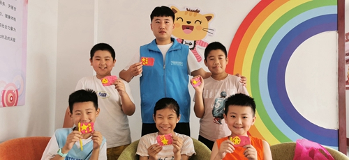 志愿者同孩子一起参与“做一面旗帜”主题活动