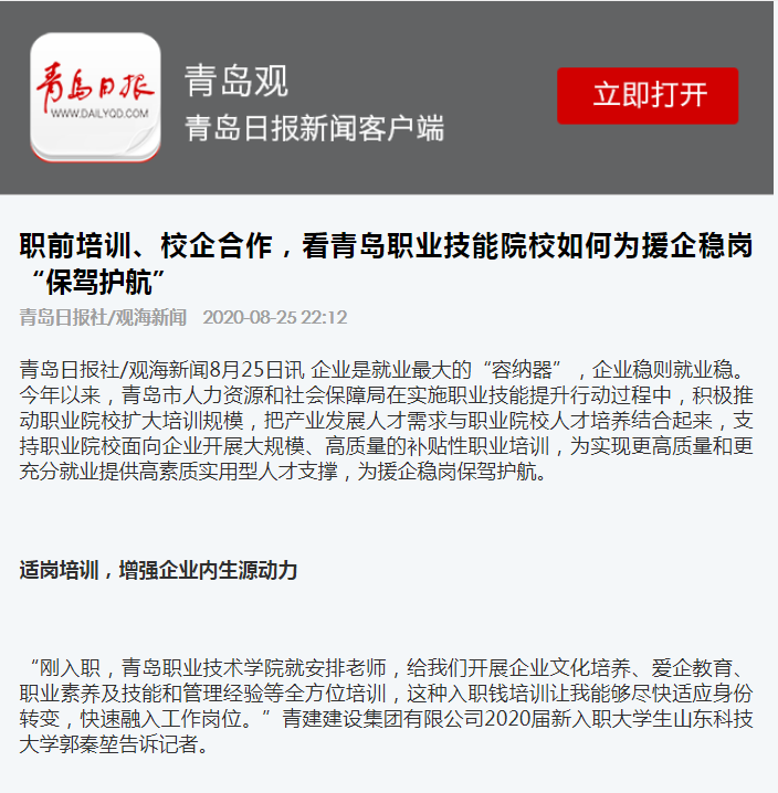青岛日报:职前培训、校企合作,看青岛职业技能院校如何为援企稳岗