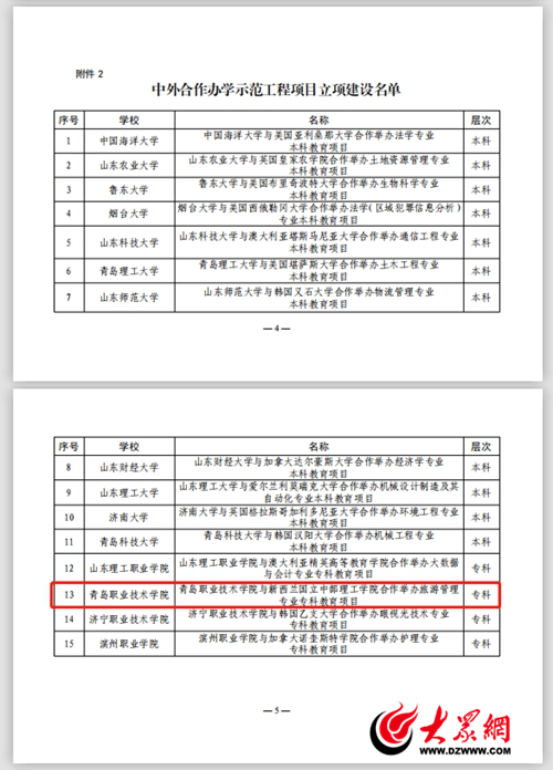 近日,山东省教育厅公布了高校中外合作办学示范工程立项建设名单,青岛职业技术学院与新西兰国立中部理工学院合作举办旅游管理专业专科教育项目成功入选。此次遴选确定了5个中外合作办学机构和15个中外合作办学项目,青岛职业技术学院为全省4所获得立项的高职院校之一。