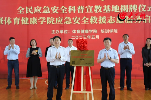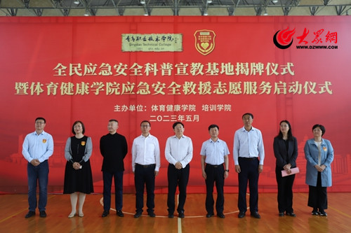 5月19日上午,“应急管理全民应急安全科普宣教基地”揭牌仪式暨青岛职业技术学院体育健康学院应急安全救援志愿服务启动仪式在青岛职业技术学院体育馆举行。青岛职业技术学院党委书记王金生、党委副书记邢广陆,青岛市应急局宣传教育处处长刘志义、西海岸新区应急管理局党委副书记、局长马强,西海岸新区区委教育工委副书记、一级调研员王红卫,北京中安瑞民科技服务有限公司总经理杨洪升出席仪式,青岛职业技术学院相关职能部门和体育健康学院相关负责人参加仪式。