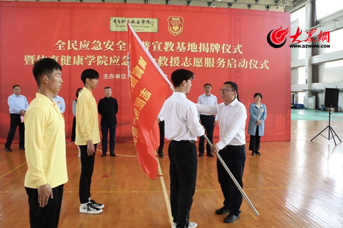 启动仪式上,王金生和刘志义共同为“全民应急安全科普宣教基地”揭牌。邢广陆代表青岛职业技术学院致欢迎辞,马强向青岛职业技术学院体育健康学院应急安全救援志愿队授旗。应急安全救援志愿队代表、体育健康学院学生张永豪带领志愿队宣誓。