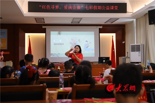 2023年,是“红色寻梦,爱满金寨”志愿服务队第二次为革命老区的孩子们带来七彩假期公益艺术课程,团队结合第一次支教时掌握的学情和经验,打造适合金寨6岁至10岁少年儿童的“德育+美育”协同育人支教课程体系,创新实施“美·德”融合性文化素质类课程,研发包含胶州剪纸、胶州年画、泰山皮影、即墨泥塑、菏泽面塑、潍坊风筝等22门适合金寨少年儿童学习的特色文化课程,将传承中华优秀传统文化与赓续红色革命文化相结合,注重将“德育”红色文化、中华优秀传统文化融入“美育”启蒙课程。