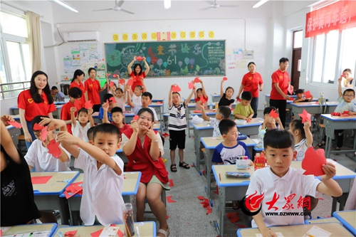 在支教课堂上,学生志愿者“活学活用”将金寨红色文化与红色经典革命故事相结合,为孩子们讲授了《鸡毛信的故事》《朱德的扁担》《“两弹一星”精神宣讲》等红色文化认知课程,通过孩子们喜爱的学习方式如制作鸡毛信、手绘红军战士卡通形象等,将红色教育深入人心,厚植少年儿童爱国、爱党情怀。