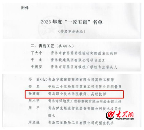 大众网:青岛职业技术学院教师荣获青岛市2023年度“一匠五创”多项荣誉称号