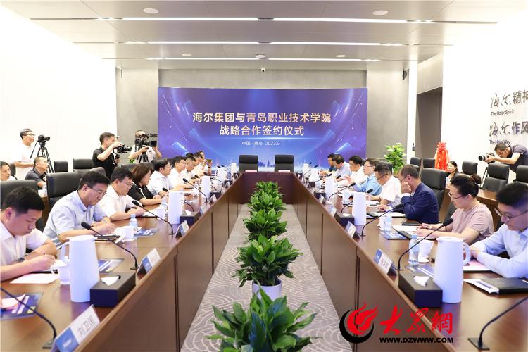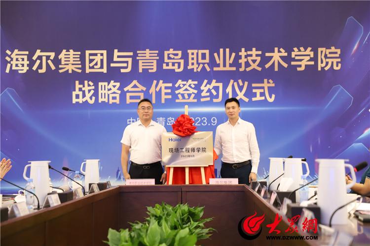 “产业发展呼唤技能人才,人才提升推动城市进步。”9月12日下午,海尔集团与青岛职业技术学院在卡奥斯生态体验中心举行新一轮战略合作协议签约仪式,正式开启双方第三个十年合作。海尔集团党委书记、董事局主席、首席执行官周云杰,青岛职业技术学院党委书记王金生出席签约仪式。海尔集团副总裁展波,青岛职业技术学院党委副书记、院长秦青松代表校企双方签署新一轮战略合作协议,卡奥斯产教融合总经理敖翔,青岛职业技术学院党委委员、副院长刘宏共同为“现场工程师学院”揭牌。海尔集团战略发展部张玉波主持签约仪式。青岛职业技术学院党委委员、副院长乔璐作校企合作发展二十年历程回顾。