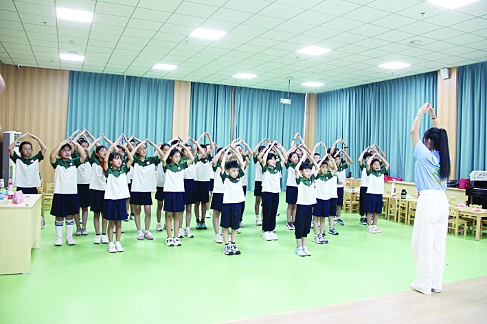暑假期间,一场以“以体育心·数智赋能”为主题的夏令营活动在乐陵市郭家中心小学开营。青岛职业技术学院体育健康学院师生团队将拓展训练与AI技术应用相结合,通过开展丰富多彩的活动,助力乡村儿童身心健康成长。图为大学生现场指导小学生练习《感恩的心》舞蹈。(朱海燕 摄影报道)