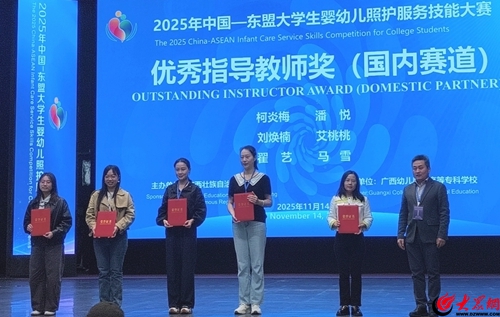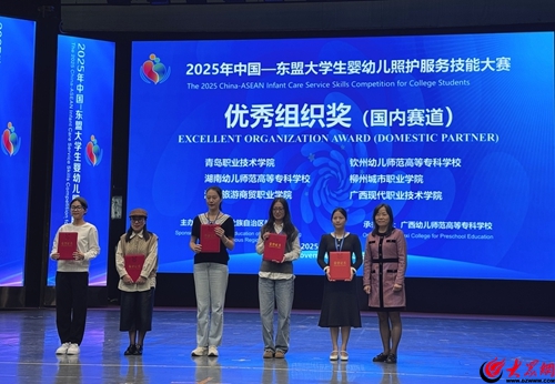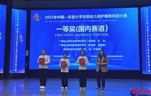 11月12日至14日,2025年中国-东盟大学生婴幼儿照护服务技能大赛在广西南宁顺利举办,共有来自中国、泰国、越南、马来西亚、印尼等国的100多名选手参加此次大赛,竞赛分国内、国际两个赛道。青岛职业技术学院教育学院婴幼儿托育服务与管理专业学子再创佳绩,刘昕、叶秋杨两名同学凭借扎实过硬的专业功底在国内32支参赛队伍的激烈角逐中脱颖而出,斩获一等奖,青岛职业技术学院荣获“优秀组织奖”,翟艺、马雪两名教师获“优秀指导教师奖”。