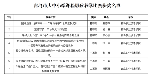 半岛网1月9日讯近日,青岛市第二届大中小学课程思政教学比赛结果正式公布。青岛职业技术学院教师表现优异,共获特等奖3项、一等奖3项、二等奖1项。其中,特等奖获奖数居全市高校首位,总获奖数位列全市高校第二。这是继青岛职业技术学院在省级课程思政研课总会取得佳绩后,在课程思政教学领域取得的又一成果,充分体现了青岛职业技术学院课程思政建设的扎实成效和教师团队出色的教学水平。