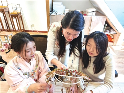 采访间隙,李晓伟正忙着接待一批来自意大利的学生,大家争相试戴各式簪花饰品,李晓伟则耐心地讲解每一件作品的寓意,这已成为她工作的常态。“簪花是非常具有中国特色的传统技艺,对外国留学生来说格外新鲜。他们不仅喜欢欣赏,也常常会购买一些作为伴手礼,许多人还加了微信,回国后仍会联系我们购买。”如今,李晓伟还搭建起线上销售渠道。“我们在网络平台上展示作品,也会出教程教大家制作簪花,努力将传统文化产品转化为商品。”她说。